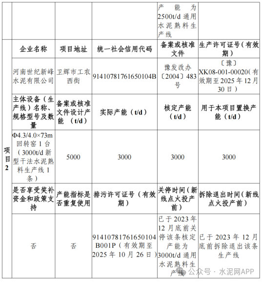 其中第一階段對用于該項目的新鄉(xiāng)市振新水泥有限公司日產(chǎn)2500噸熟料生產(chǎn)線和河南世紀新峰水泥有限公司日產(chǎn)3000噸熟料生產(chǎn)線產(chǎn)能,按照2:1減量置換為2750t/d產(chǎn)能;