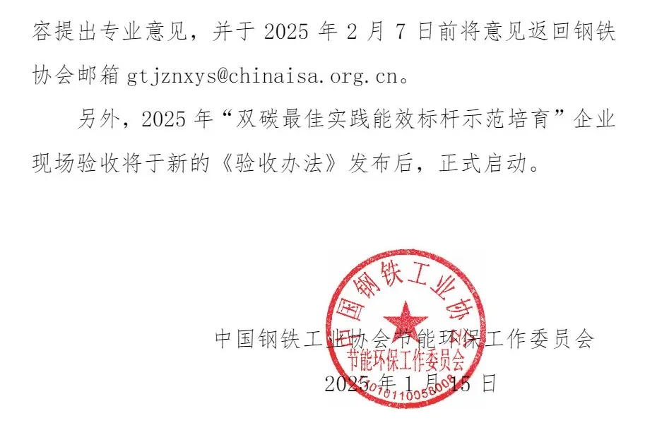 關于征求《鋼鐵“雙碳最佳實踐能效標桿示范”驗收辦法(試行)》修訂意見的函