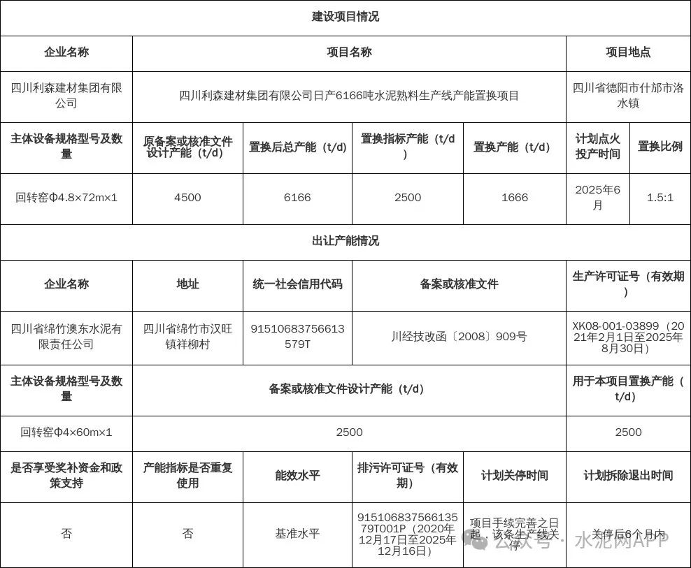 置換方案顯示,四川利森建材集團置換產(chǎn)能1666t/d,出讓2500t/d產(chǎn)能來自四川綿竹澳東水泥,置換比例1.5:1。