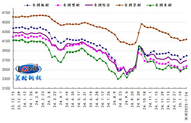 2025年第3周(2025.1.13-1.17)蘭格鋼鐵全國(guó)絕對(duì)價(jià)格指數(shù)為3670元,較上周上升1.3%,較去年同期下降13.6%;其中,蘭格鋼鐵長(zhǎng)材絕對(duì)價(jià)格指數(shù)為3510元,較上周上升1.4%,較去年同期下降13.9%;蘭格鋼鐵型材絕對(duì)價(jià)格指數(shù)為3538元,較上周上升1.5%,較去年同期下降15.2%;蘭格鋼鐵板材絕對(duì)價(jià)格指數(shù)為3765元,較上周上升1.5%,較去年同期下降13.7%;蘭格鋼鐵管材絕對(duì)價(jià)格指數(shù)為4121元,較上周上升0.3%,較去年同期下降10.7%。
