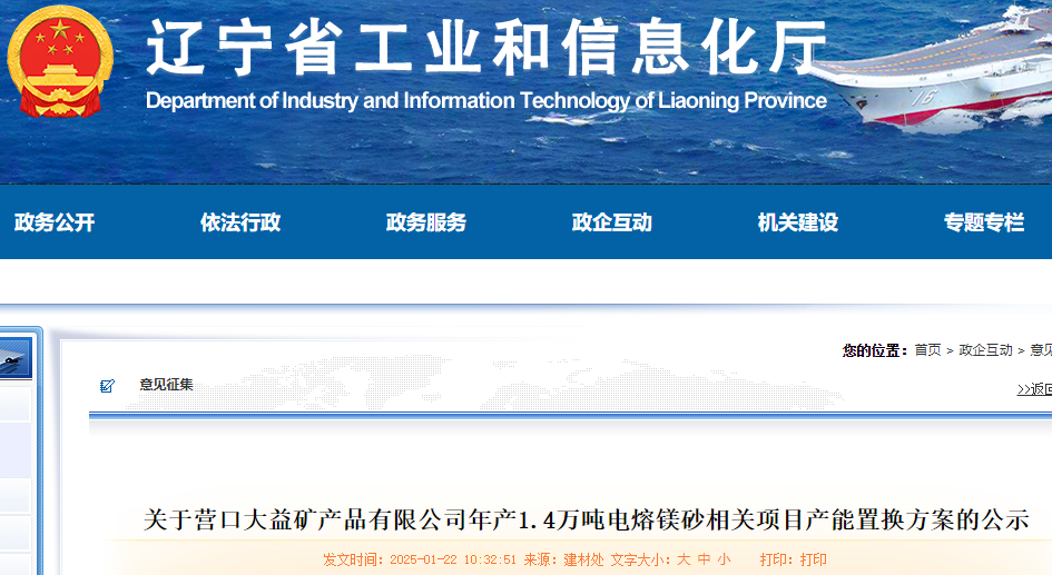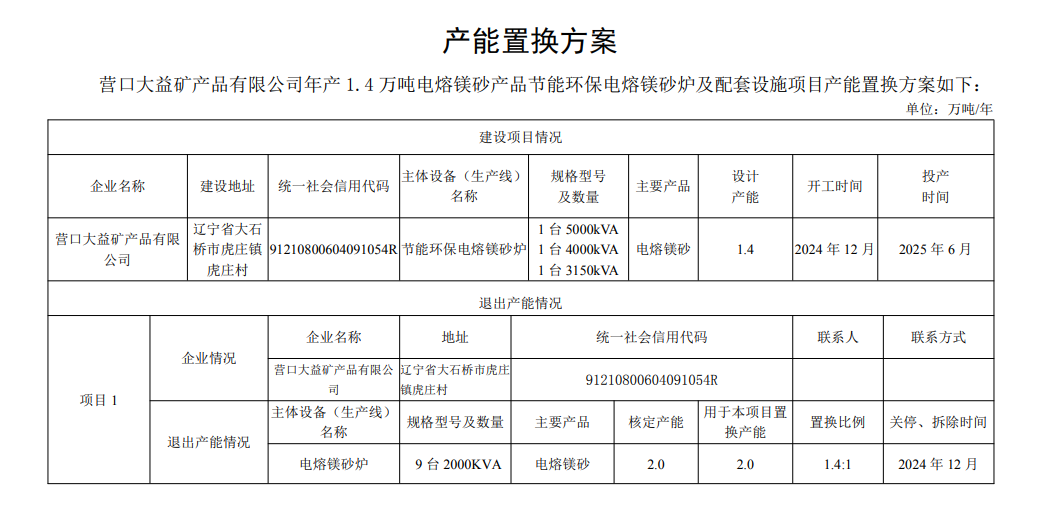 按照《遼寧省人民政府辦公廳關(guān)于推進(jìn)菱鎂行業(yè)高質(zhì)量發(fā)展的實(shí)施意見》(遼政辦發(fā)〔2023〕15號(hào))、《遼寧省菱鎂礦浮選及鎂砂行業(yè)產(chǎn)能置換辦法》(遼工信建材〔2024〕18號(hào))要求,根據(jù)菱鎂行業(yè)專項(xiàng)整治工作進(jìn)展,經(jīng)企業(yè)申請(qǐng)、市工信部門初審、省級(jí)現(xiàn)場(chǎng)復(fù)核,現(xiàn)將營(yíng)口大益礦產(chǎn)品有限公司年產(chǎn)1.4萬(wàn)噸電熔鎂砂產(chǎn)品節(jié)能環(huán)保電熔鎂砂爐及配套設(shè)施項(xiàng)目產(chǎn)能置換方案予以公示,公示期10個(gè)工作日。