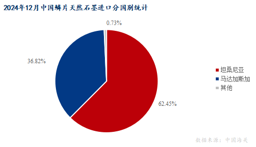三、鱗片石墨主要進(jìn)出口國家2024年12月天然鱗片石墨進(jìn)口的3156.18噸,從坦桑尼亞進(jìn)口量最大,占比為62.45%,從馬達(dá)加斯加進(jìn)口量占比為36.82%,其他貿(mào)易伙伴進(jìn)口總量為23.14噸,占比不足1%。