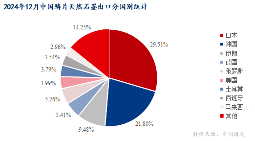 2024年12月天然鱗片石墨出口的5930.11噸,其中日本出口量最大為1750.256噸,占總比重的29.51%,其次是韓國出口量為1292.51噸,占總比重的21.8%,其他貿(mào)易伙伴出口量占比為14.25%。