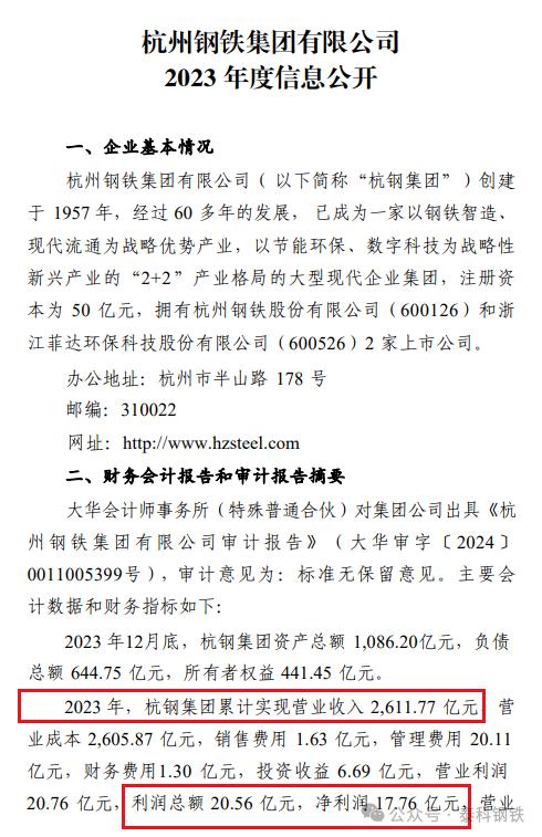 2024年6月24日,杭鋼集團(tuán)發(fā)布2023年度信息公開(kāi)!2023年,杭鋼集團(tuán)累計(jì)實(shí)現(xiàn)營(yíng)業(yè)收入2,611.77億元,營(yíng) 業(yè)成本2,605.87億元,銷(xiāo)售費(fèi)用 1.63億元,管理費(fèi)用20.11億元,財(cái)務(wù)費(fèi)用1.30億元,投資收益6.69億元,營(yíng)業(yè)利潤(rùn)20.76億元,利潤(rùn)總額20.56億元,凈利潤(rùn)17.76億元。營(yíng)業(yè)利潤(rùn)率0.79%,凈資產(chǎn)收益率4.08%。