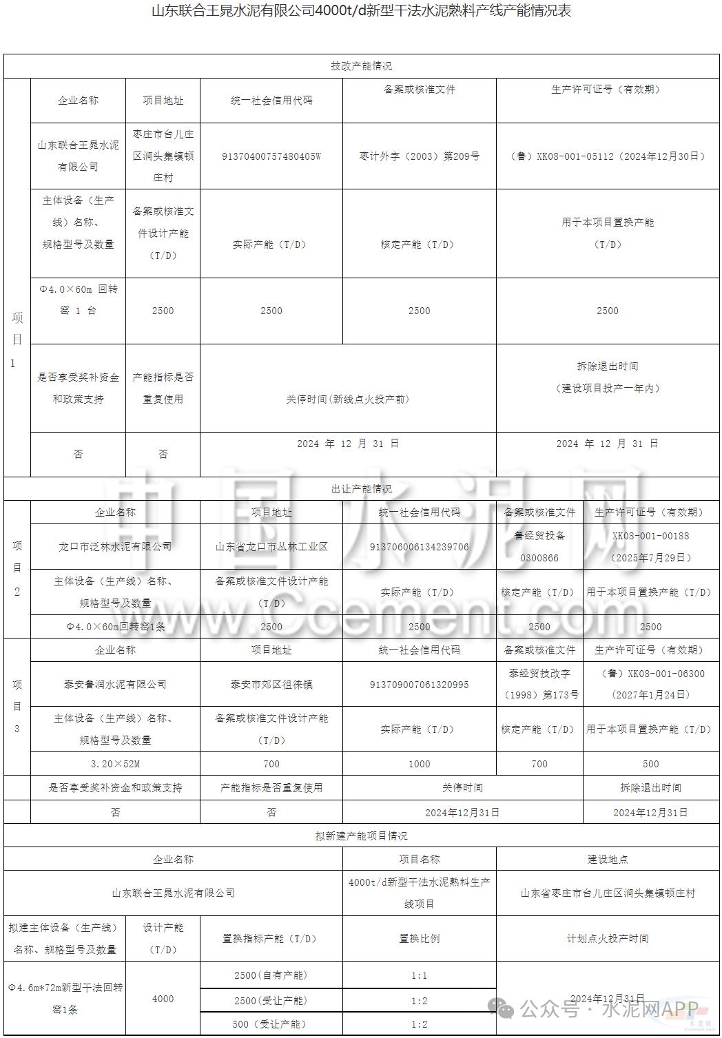 根據山東工信廳發(fā)布,山東聯(lián)合王晁水泥有限公司4000t/d熟料項目產能置換項目如下: