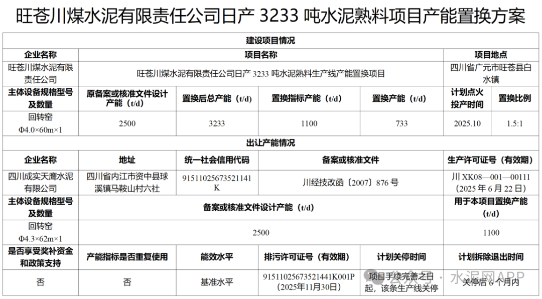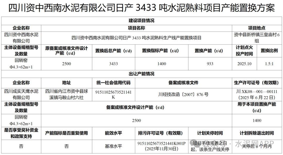 產(chǎn)能置換方案表顯示,四川成實天鷹水泥出讓2500t/d熟料產(chǎn)能,其中1400t/d產(chǎn)能用于置換補(bǔ)充四川資中西南水泥生產(chǎn)線,1100t/d產(chǎn)能用于置換補(bǔ)充旺蒼川煤水泥生產(chǎn)線,置換比例均為1.5:1。