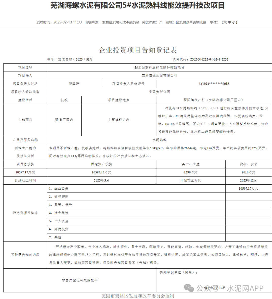 2月13日,安徽省蕪湖市繁昌區(qū)發(fā)展和改革委員會發(fā)布《蕪湖海螺水泥有限公司5#水泥熟料線能效提升技改項目》情況顯示,蕪湖海螺水泥有限公司對現(xiàn)有5#水泥熟料線(12000t/d)進行綜合能效體升技術(shù)改造。