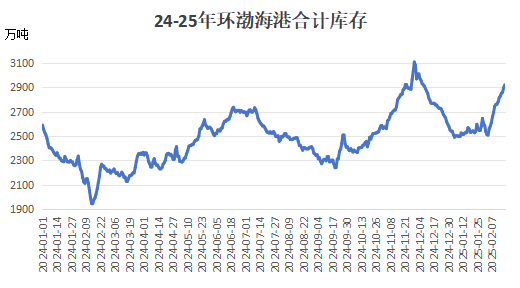 截至2月18日,秦皇島港5500大卡報價743元/噸,日環(huán)比下降3元/噸,已經(jīng)創(chuàng)下自2021年5月以來的新低;港口庫存方面,主產(chǎn)地煤礦陸續(xù)復(fù)產(chǎn),國有大礦產(chǎn)能已恢復(fù)至正常水平,且大秦線日運(yùn)量提升至100-110萬噸,資源調(diào)入量持續(xù)增加,使得港口庫存壓力不斷提升,截至2月18日,環(huán)渤海港合計(jì)庫存已至2921.6萬噸,再次逼近3000萬大關(guān),且壘庫趨勢依舊。