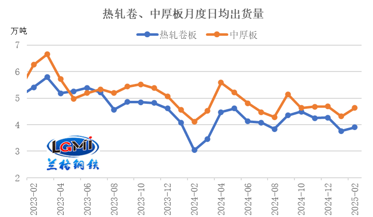 2月份,受益于“搶出口”及制造業(yè)補庫支撐,板材產(chǎn)品月度出貨量保持一定韌性。蘭格鋼鐵網(wǎng)統(tǒng)計的2月份出貨數(shù)據(jù)中,全國16個重點城市熱軋卷板月度日均出貨量3.9萬噸(詳見圖3),較上月增加0.14萬噸,環(huán)比增長3.7%,同比增長28.3%。全國15個重點城市105家重點流通企業(yè)中厚板日均出貨量為4.63萬噸,較上月增加0.32萬噸,環(huán)比上升7.4%,同比增長12.4%。隨著春節(jié)因素淡出及各地集中復(fù)工復(fù)產(chǎn),“兩重”、“兩新”等一攬子存量及增量政策持續(xù)推進(jìn),制造業(yè)將穩(wěn)定向好運行,預(yù)計3月份制造業(yè)用鋼需求將繼續(xù)恢復(fù)。
