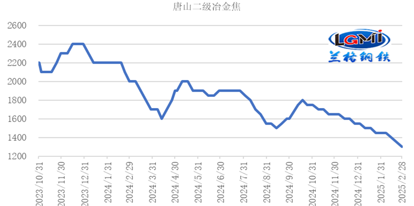焦炭方面,2月份焦炭價格經(jīng)歷三輪提降落地。據(jù)蘭格鋼鐵網(wǎng)監(jiān)測數(shù)據(jù)顯示,截至2月底,唐山地區(qū)二級冶金焦價格為1300元/噸,較上月底下跌150元/噸(詳見圖6)。從均值來看,2月份唐山地區(qū)二級冶金焦均價為1388元/噸,較上月下跌107元/噸。