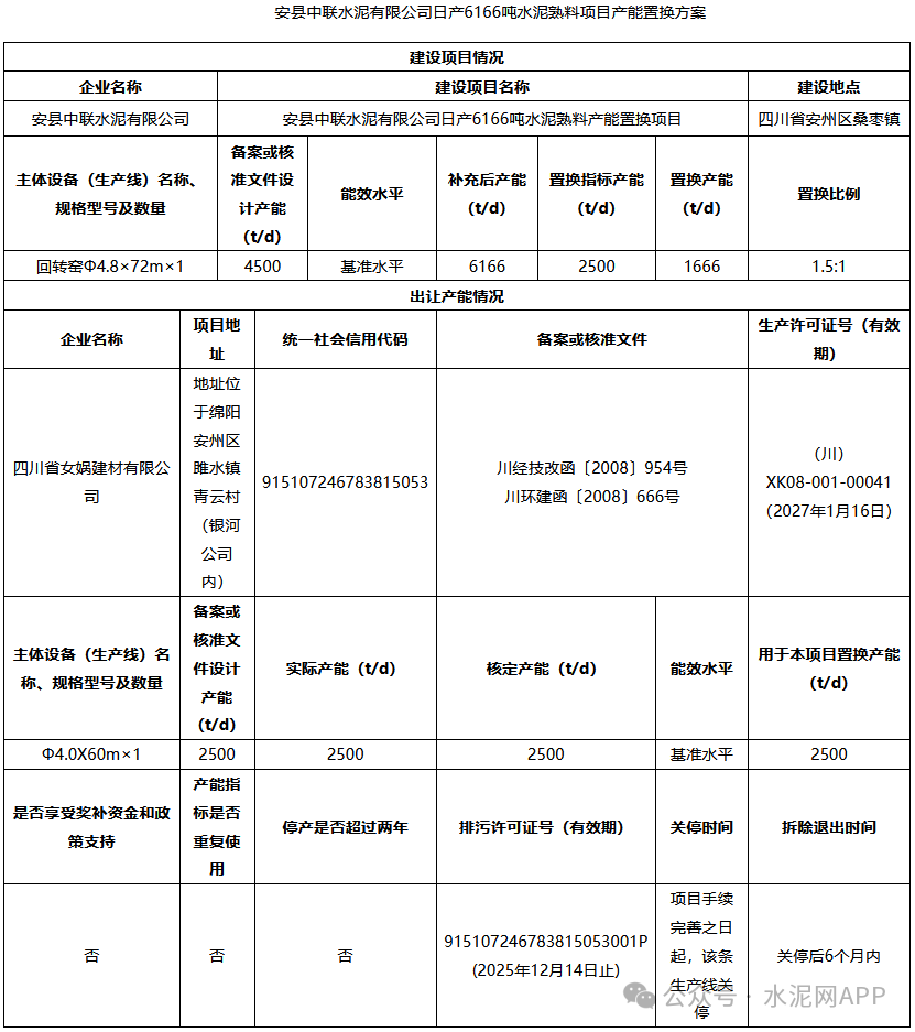 置換方案顯示,安縣中聯(lián)水泥生產(chǎn)線置換補(bǔ)充產(chǎn)能1666t/d,補(bǔ)充后生產(chǎn)線產(chǎn)能為6166t/d。出讓產(chǎn)能2500t/d來(lái)自四川省女?huà)z建材有限公司,置換比例1.5:1。