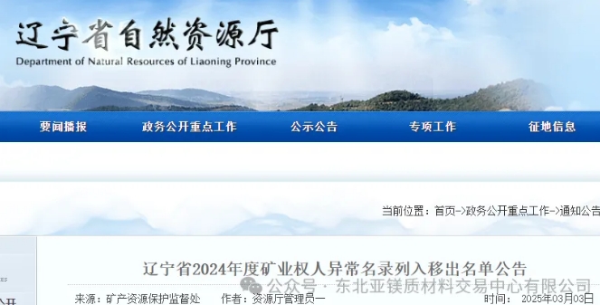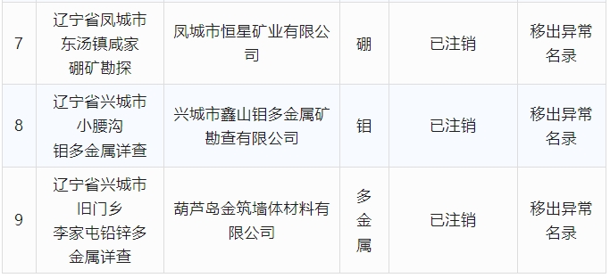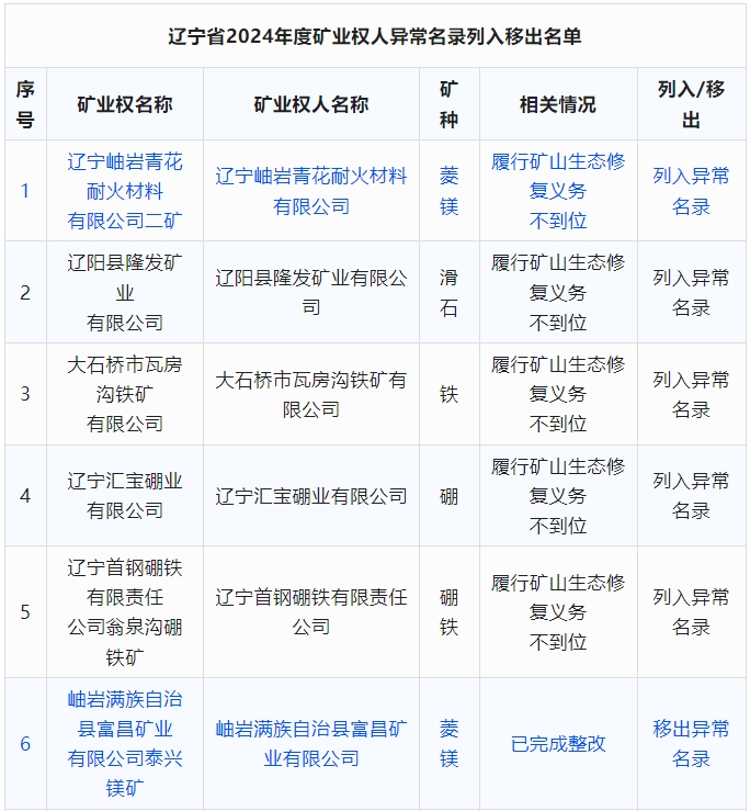 按照《礦業(yè)權(quán)人勘查開采信息管理辦法》(自然資源部令第13號)《自然資源部辦公廳關(guān)于做好2024年礦業(yè)權(quán)人勘查開采信息公示工作的通知》(自然資辦函〔2024〕213號)等要求,我省開展了礦業(yè)權(quán)人信息管理實地核查工作。根據(jù)核查結(jié)果,對擬列入、移出異常名錄的名單進(jìn)行了公示?,F(xiàn)公示期滿,決定將遼寧岫巖青花耐火材料有限公司二礦等5個礦業(yè)權(quán)列入異常名錄,將岫巖滿族自治縣富昌礦業(yè)有限公司泰興鎂礦等4個礦業(yè)權(quán)移出異常名錄(詳細(xì)名單見附件)。特此公告。