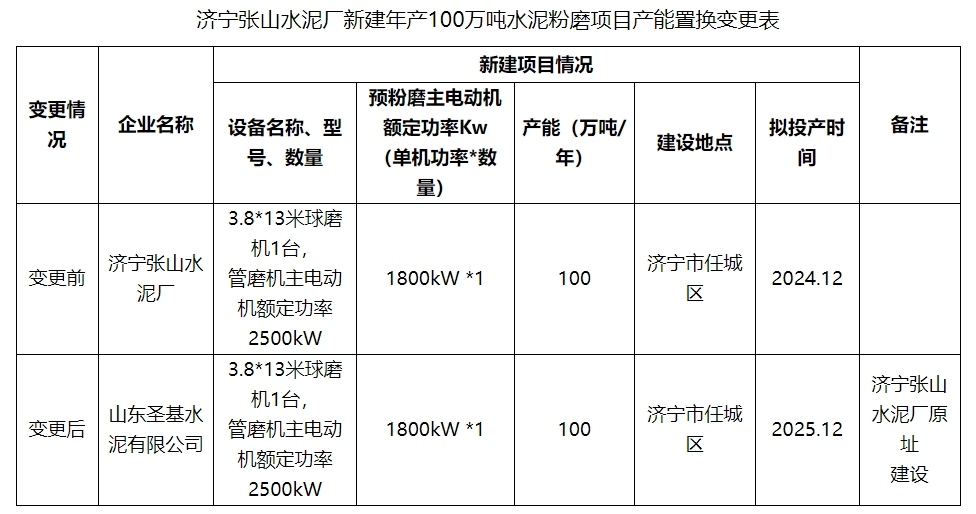 公告顯示,濟寧張山水泥廠新建年產(chǎn)100萬噸水泥粉磨項目擬變更產(chǎn)能置換實施主體為山東圣基水泥有限公司。