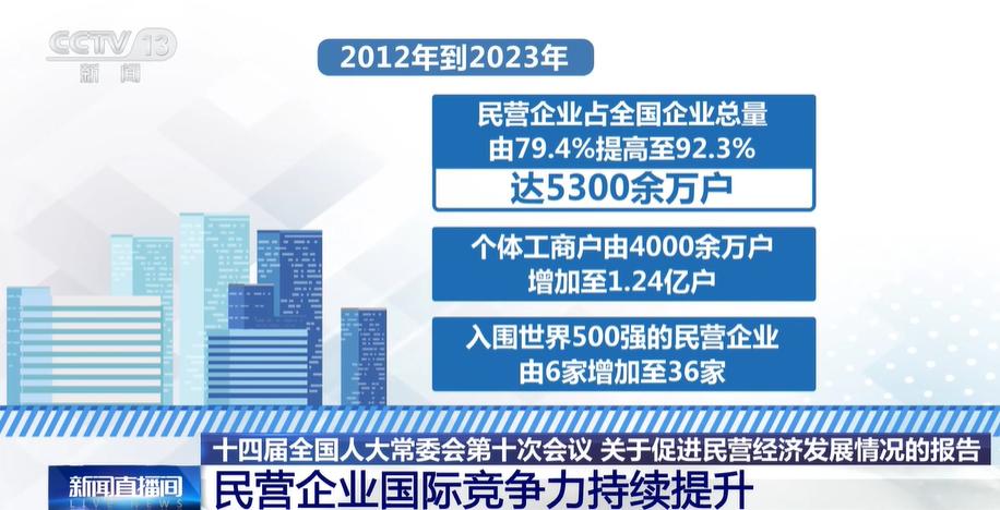 報(bào)告稱,民營經(jīng)濟(jì)規(guī)模實(shí)力持續(xù)提升,2012年到2023年,民營企業(yè)占全國企業(yè)總量由79.4%提高至92.3%,達(dá)5300余萬戶,個(gè)體工商戶由4000余萬戶增加至1.24億戶,入圍世界500強(qiáng)的民營企業(yè)由6家增加至36家;民營經(jīng)濟(jì)創(chuàng)新水平持續(xù)提升,2012年到2022年,國家高新技術(shù)企業(yè)中民營企業(yè)從2.8萬家增長至35.9萬家,占比由62.4%提升至90.9%。
