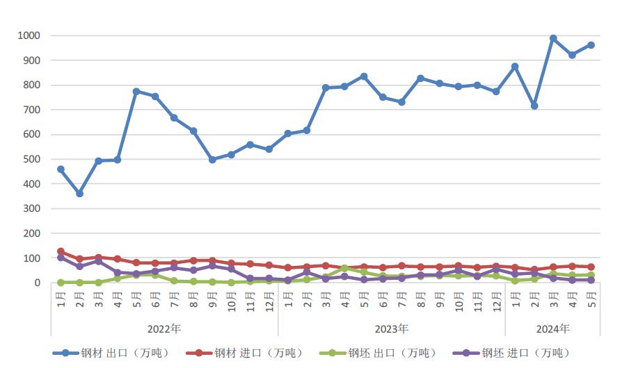 2024年5月,我國(guó)出口鋼材963.1萬(wàn)噸,環(huán)比增加40.7萬(wàn)噸,同比增加127.5萬(wàn)噸;出口平均單價(jià)760.7美元/噸,環(huán)比下跌2.2%,同比下跌17.5%。1-5月,出口鋼材4465.5萬(wàn)噸,同比增長(zhǎng)24.7%;出口平均單價(jià)780.2美元/噸,同比下跌29.0%;出口鋼坯116.3萬(wàn)噸,同比下降17.4%;粗鋼凈出口4321.5萬(wàn)噸,同比增長(zhǎng)891.0萬(wàn)噸,增幅26.0%。