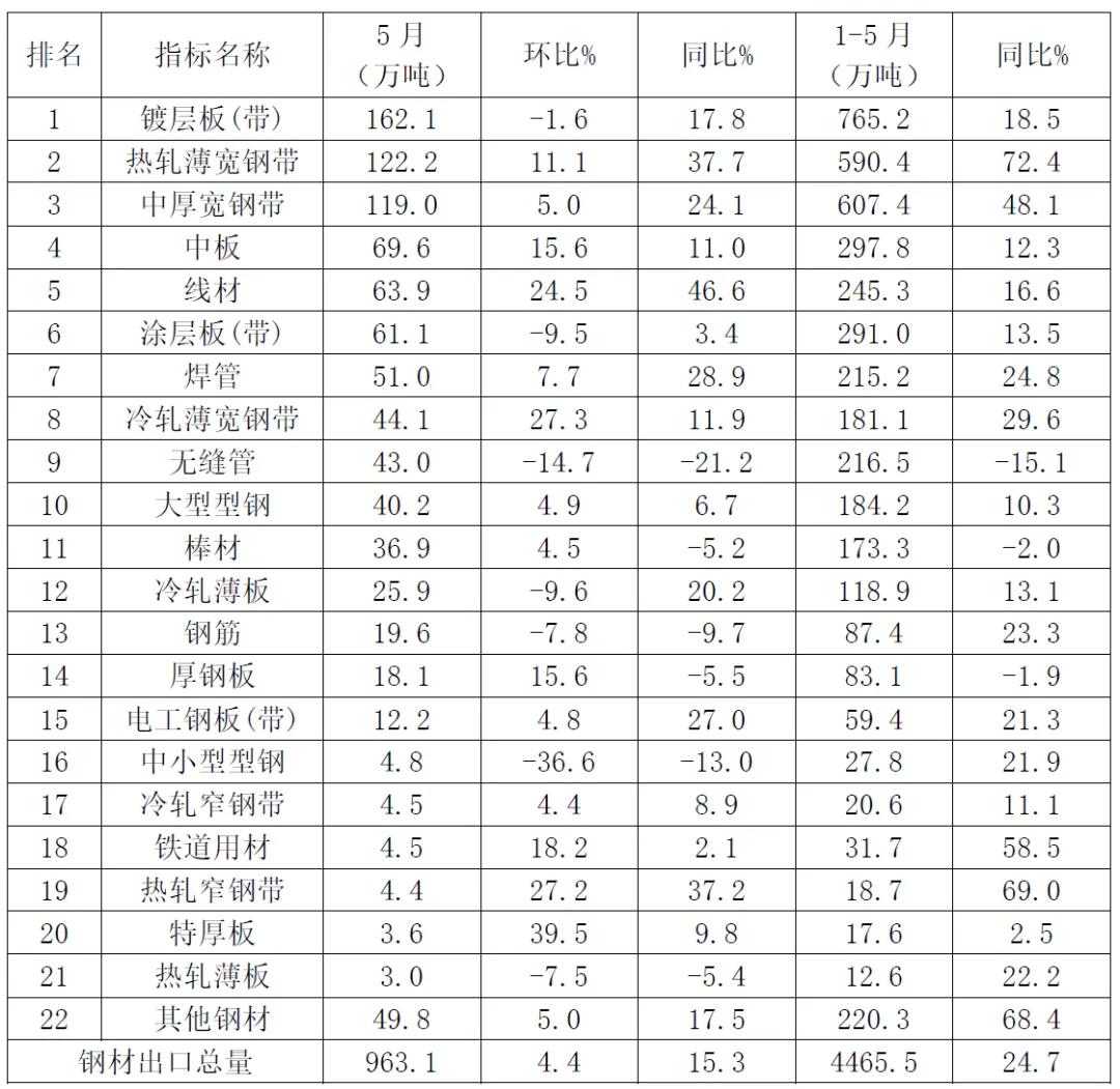 表2 2024年5月主要初級(jí)鋼鐵產(chǎn)品出口情況