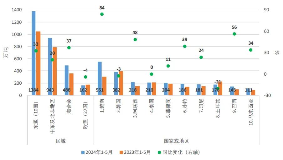 2024年5月,我國(guó)對(duì)主要國(guó)家和區(qū)域出口環(huán)比增長(zhǎng)。對(duì)東盟出口量為299.5萬(wàn)噸,環(huán)比增長(zhǎng)2.4%,其中對(duì)泰國(guó)和菲律賓環(huán)比分別增長(zhǎng)20.7%和11.8%。出口主要國(guó)家和地區(qū)中,對(duì)智利、中國(guó)臺(tái)灣和巴基斯坦出口環(huán)比增長(zhǎng)較為顯著,增幅分別為125.2%、80.0%和65.8%;對(duì)沙特出口出現(xiàn)下滑。1-5月,我國(guó)對(duì)除歐盟以外的主要區(qū)域出口保持增長(zhǎng),其中東盟和海合會(huì)累計(jì)出口量同比分別增長(zhǎng)32.6%和37.0%。對(duì)越南出口同比增長(zhǎng)83.9%至551.1萬(wàn)噸,已達(dá)到2023年對(duì)越出口總量的60.8%。對(duì)阿聯(lián)酋和巴西出口增速也分別達(dá)到48.5%和56.3%。