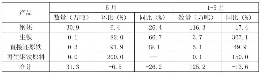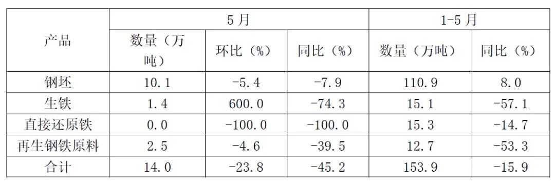 2024年5月,我國(guó)進(jìn)口初級(jí)鋼鐵產(chǎn)品14.0萬(wàn)噸,環(huán)比下降23.8%,同比下降45.2%。其中,鋼坯進(jìn)口量環(huán)比連續(xù)3個(gè)月下降,其他品種也保持在較低水平。