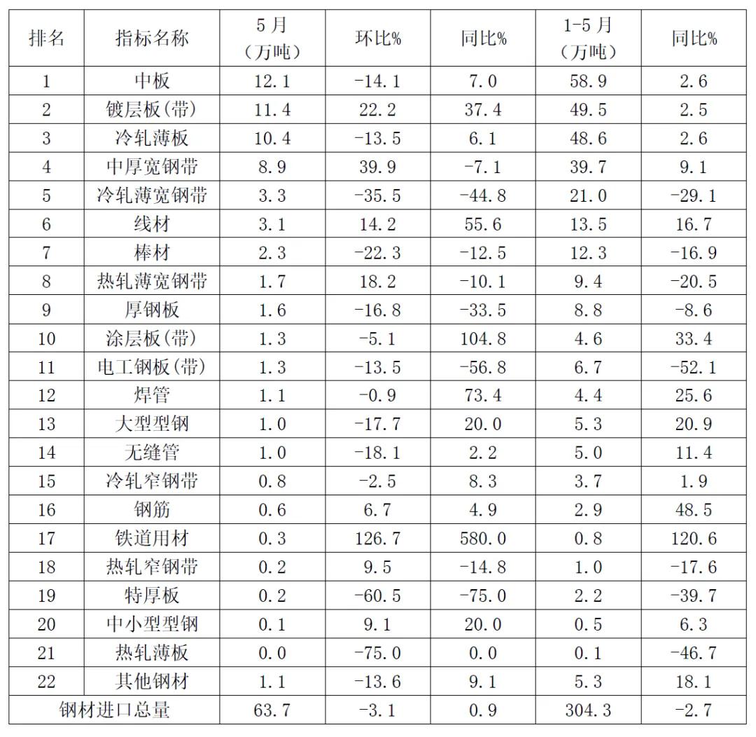 表3 2024年5月分品種鋼材進(jìn)口情況