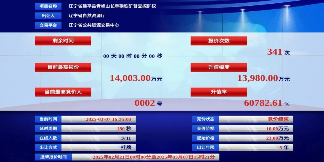 3月7日,遼寧省自然資源廳1月委托省公共資源交易中心網(wǎng)上掛牌出讓的32宗探礦權(quán)進(jìn)入競拍交易第二天。當(dāng)日,10宗探礦權(quán)成功出讓,總價達(dá)2.2億元。其中,“遼寧省建平縣青峰山長皋磷鐵礦普查探礦權(quán)”勘查面積2.2734平方公里,掛牌起始價23萬元,經(jīng)過341輪激烈競價,最終以1.4億元成交。
