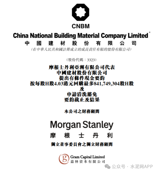 3月5日晚間,中國建材公布,有關摩根士丹利亞洲有限公司代表公司提出有條件現(xiàn)金要約按每股H股4.03港元回購最多約8.42億股H股,要約已于最后接納時限(即2025年3月5日(星期三)下午四時正)截止。于最后接納時限,過戶登記處已接獲接納股東根據(jù)要約就合共約17.65億股H股提出的有效接納,占公司根據(jù)要約將予回購的最高數(shù)目約209.69%,及于本公告日期已發(fā)行股份總數(shù)約20.93%及已發(fā)行H股總數(shù)約38.72%。