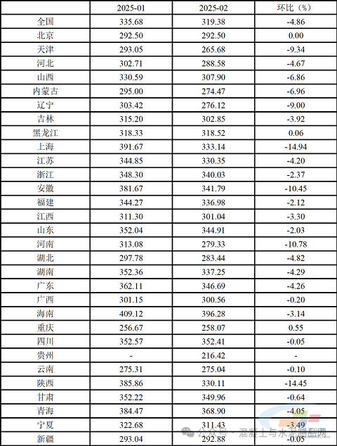 表:2月份全國30個省市C30預(yù)拌混凝土平均價格及變化情況(元/方,%)