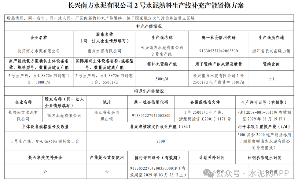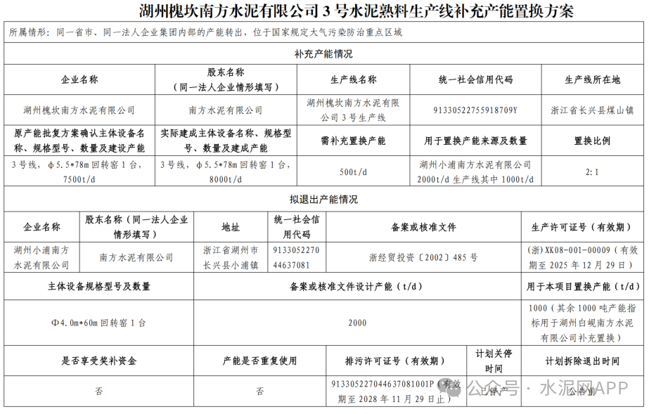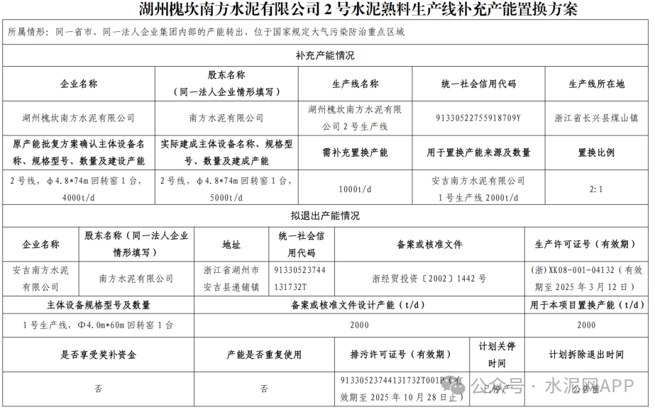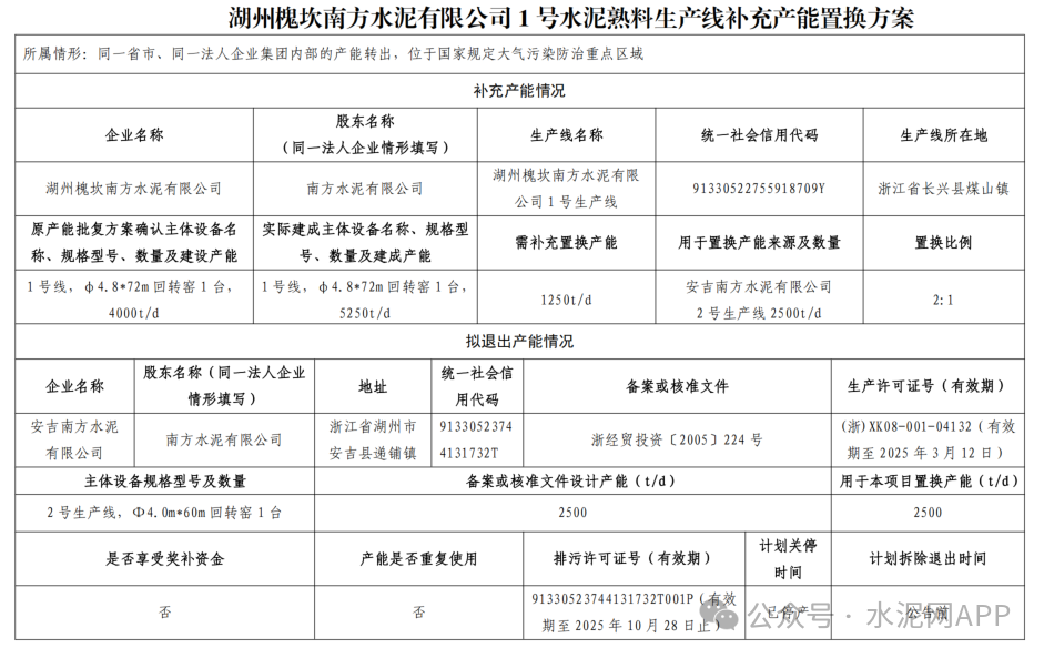 補(bǔ)充置換方案顯示:湖州槐坎南方水泥1號(hào)線置換補(bǔ)充產(chǎn)能1250t/d;湖州槐坎南方水泥2號(hào)線置換補(bǔ)充產(chǎn)能1000t/d;