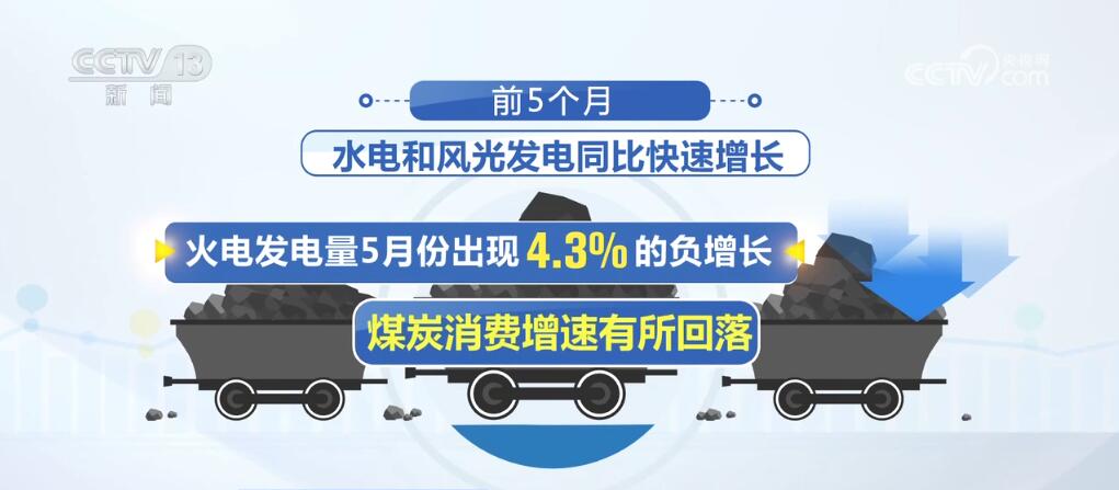 前5個(gè)月,水電和風(fēng)光發(fā)電同比快速增長(zhǎng),也讓火電發(fā)電量在5月份出現(xiàn)了4.3%的負(fù)增長(zhǎng),煤炭消費(fèi)增速有所回落。