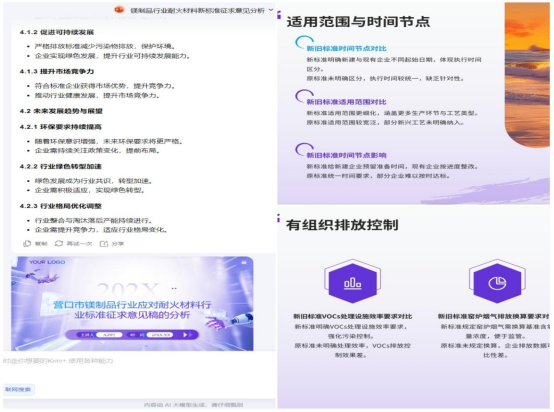 同時(shí),隨著人工智能技術(shù)的飛速發(fā)展,人工智能AI在生態(tài)環(huán)境領(lǐng)域展現(xiàn)出巨大潛力。為推進(jìn)智能AI在生態(tài)環(huán)境領(lǐng)域的應(yīng)用,探索環(huán)境監(jiān)管工作中創(chuàng)新前沿,發(fā)揮DeepSeek、Kimi等人工智能系統(tǒng)驅(qū)動(dòng)力量,市生態(tài)環(huán)境局依靠DeepSeek在數(shù)據(jù)處理、模式識(shí)別、預(yù)測(cè)分析等方面具有獨(dú)特優(yōu)勢(shì),成功交互并生成《營(yíng)口市鎂制品行業(yè)應(yīng)對(duì)耐火材料行業(yè)標(biāo)準(zhǔn)征求意見(jiàn)稿的分析》演示文稿,對(duì)我市耐火材料行業(yè)進(jìn)行深入思考,呈現(xiàn)多方面、多維度、多細(xì)節(jié)的工作思維導(dǎo)圖,所含內(nèi)容與我市生態(tài)環(huán)境治理需求高度契合,為生態(tài)環(huán)境監(jiān)管工作帶來(lái)的巨大變革潛力。