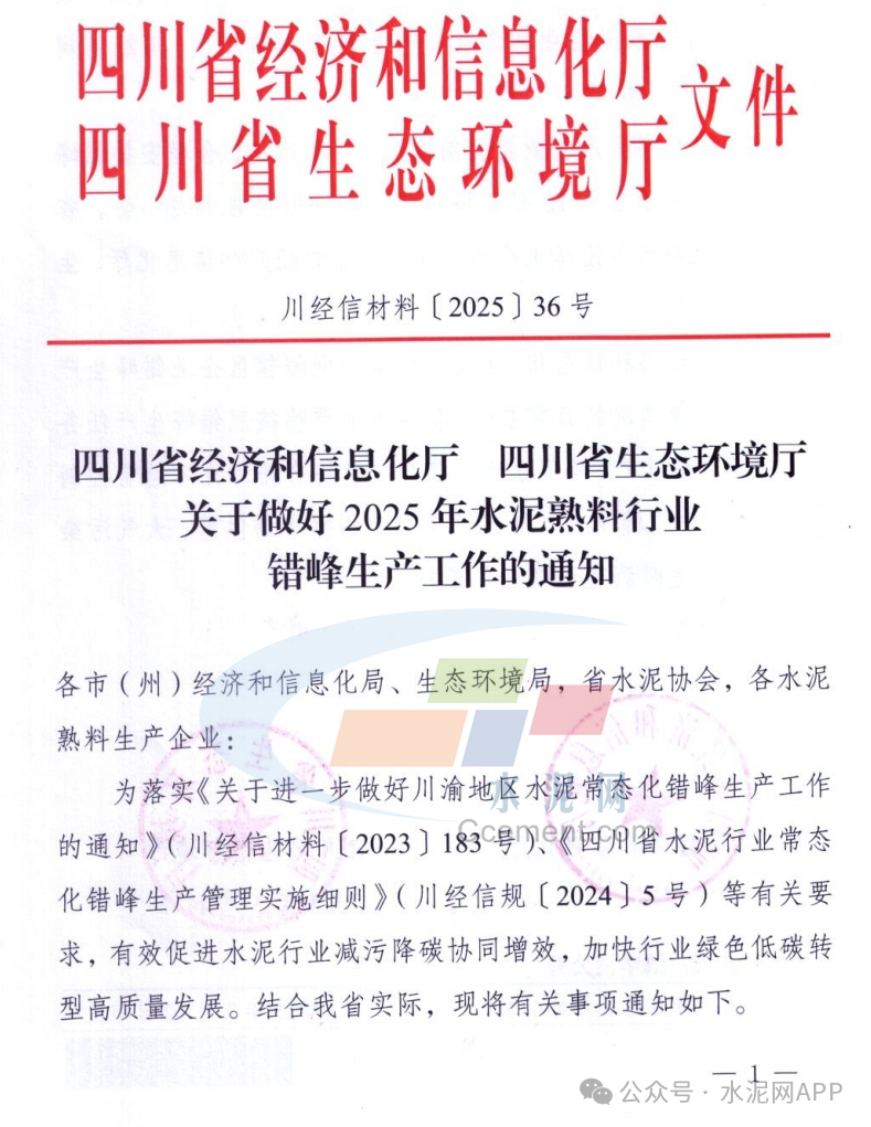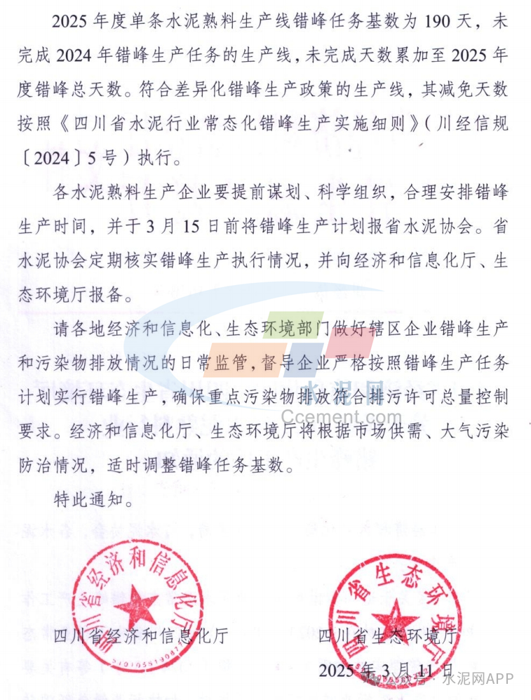 近日,四川省經濟和信息化廳 四川省生態(tài)環(huán)境廳發(fā)布《關于做好2025年水泥熟料行業(yè)錯峰生產工作的通知》。