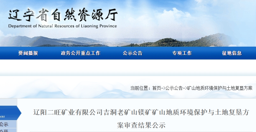 根據(jù)《國土資源部辦公廳關(guān)于做好礦山地質(zhì)環(huán)境保護(hù)與土地復(fù)墾方案編報有關(guān)工作的通知》(國土資規(guī)〔2016〕21號)和關(guān)于印發(fā)《礦山地質(zhì)環(huán)境保護(hù)與土地復(fù)墾方案省級審查管理辦法(試行)》的通知(遼自然資發(fā)〔2022〕129號)有關(guān)要求,我廳委托自然資源事務(wù)服務(wù)中心組織專家對遼陽二旺礦業(yè)有限公司吉洞老礦山鎂礦礦山地質(zhì)環(huán)境與土地復(fù)墾方案進(jìn)行了審查?,F(xiàn)將擬同意通過的該方案及專家評審意見進(jìn)行公示,公示期自發(fā)布之日起7個工作日。