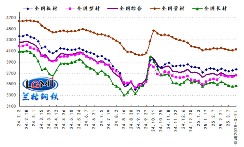 2025年第11周(2025.3.10-3.14)蘭格鋼鐵全國絕對價格指數(shù)為3645元,較上周下降0.1%,較去年同期下降9.6%;其中,蘭格鋼鐵長材絕對價格指數(shù)為3457元,較上周下降0.4%,較去年同期下降8.6%;蘭格鋼鐵型材絕對價格指數(shù)為3627元,較上周下降0.1%,較去年同期下降10.3%;蘭格鋼鐵板材絕對價格指數(shù)為3746元,較上周上升0.3%,較去年同期下降10.3%;蘭格鋼鐵管材絕對價格指數(shù)為4107元,較上周下降0.3%,較去年同期下降10.1%。