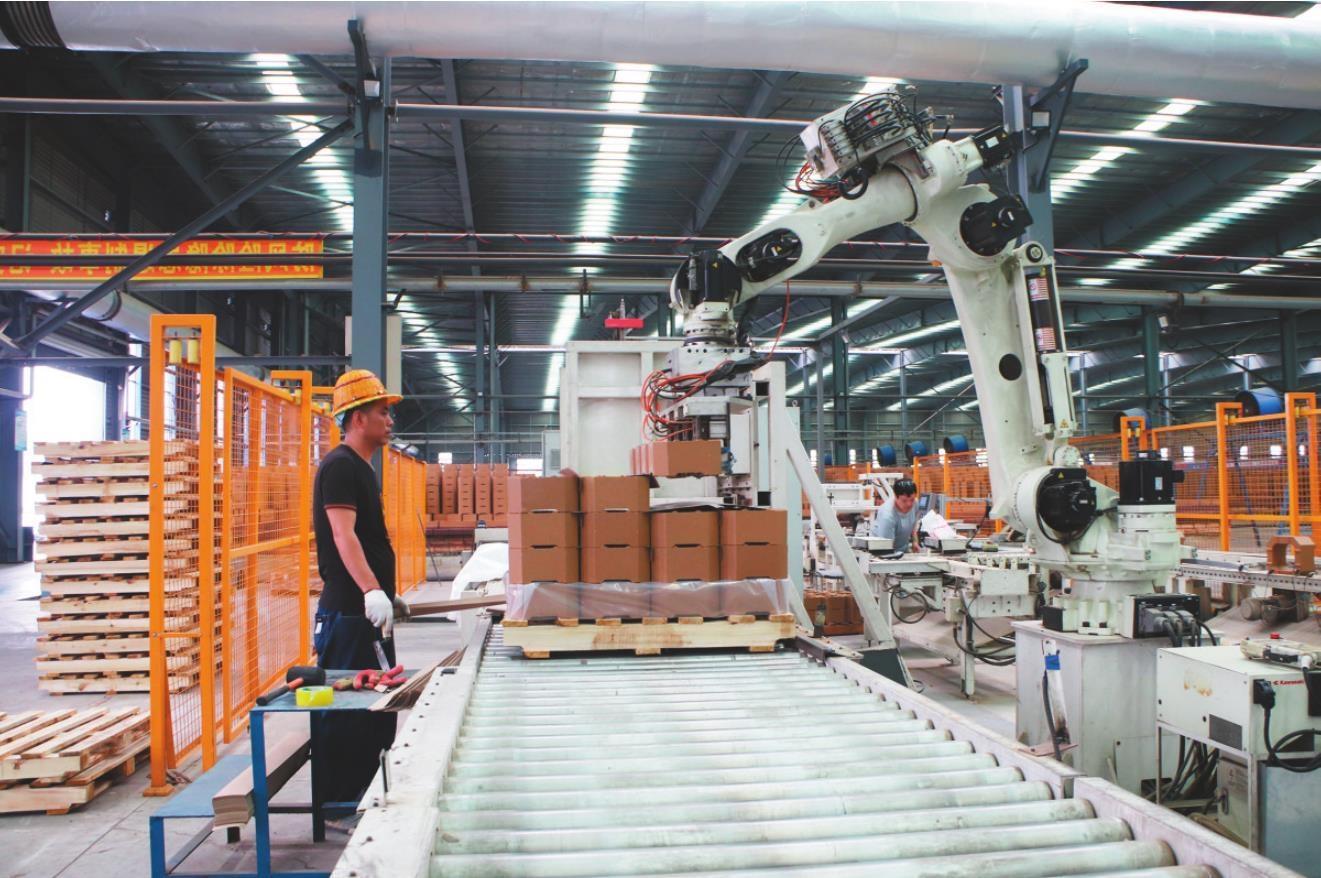 后英集團海城市勝輝耐火材料制造有限公司生產(chǎn)車間里,機械臂抓取耐火磚。