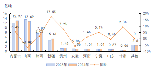 自煤炭行業(yè)經(jīng)過(guò)供給側(cè)改革、兼并重組等舉措后,晉陜蒙新四大主產(chǎn)區(qū)煤炭產(chǎn)業(yè)集中度進(jìn)一步提升,成為全國(guó)煤炭增產(chǎn)的核心力量,其中新疆增長(zhǎng)尤為突出。2024年全國(guó)23個(gè)煤炭生產(chǎn)省區(qū)中,有13個(gè)省區(qū)增產(chǎn),10個(gè)省區(qū)減產(chǎn);其中產(chǎn)量破億噸的省區(qū)8個(gè),產(chǎn)量由高到低依次為內(nèi)蒙古、山西、陜西、新疆、貴州、安徽、河南、寧夏;產(chǎn)量在5000萬(wàn)噸至1億噸的有4個(gè),產(chǎn)量由高到低依次為山東、甘肅、云南、黑龍江。