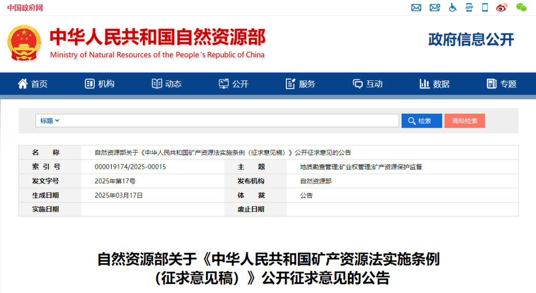為貫徹落實(shí)黨中央、國(guó)務(wù)院關(guān)于深化礦產(chǎn)資源管理制度改革的決策部署,進(jìn)一步健全完善以《礦產(chǎn)資源法》為核心的礦產(chǎn)資源法律法規(guī)體系,自然資源部起草了《中華人民共和國(guó)礦產(chǎn)資源法實(shí)施條例(征求意見(jiàn)稿)》。為了增強(qiáng)立法的公開(kāi)性和透明度,提高立法質(zhì)量,現(xiàn)將《中華人民共和國(guó)礦產(chǎn)資源法實(shí)施條例(征求意見(jiàn)稿)》及其說(shuō)明公布,征求社會(huì)各界意見(jiàn)。公眾可以登錄自然資源部門(mén)戶網(wǎng)站(http://www.mnr.gov.cn)查閱征求意見(jiàn)稿及其說(shuō)明。有關(guān)意見(jiàn)建議可以在2025年4月15日前通過(guò)電子郵件方式發(fā)送至:fgzqyj@mail.mnr.gov.cn。