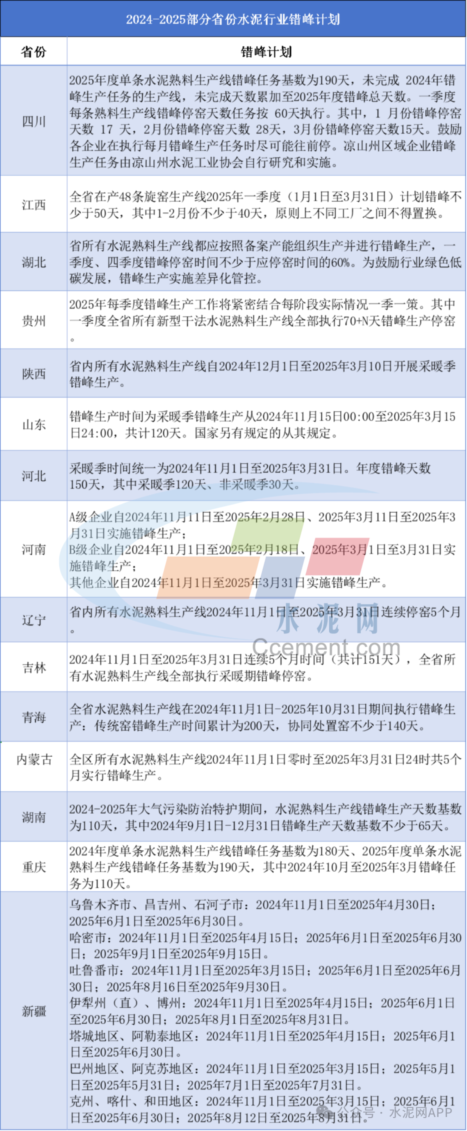 此外,塔牌表示,2025年廣西每條生產(chǎn)線(xiàn)平均全年錯(cuò)峰160天,福建預(yù)計(jì)全年錯(cuò)峰170天。2025年部分省份水泥企業(yè)錯(cuò)峰計(jì)劃匯總見(jiàn)下表:
