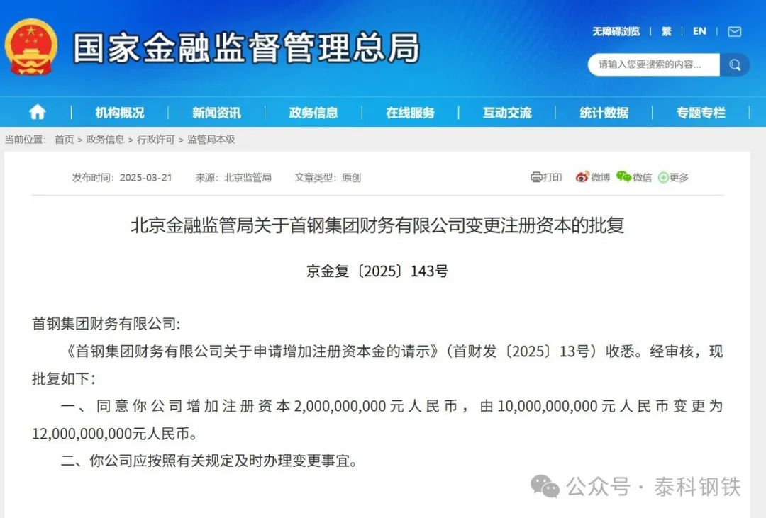 3月21日,北京金融監(jiān)管局公布相關(guān)批復(fù),同意首鋼集團財務(wù)有限公司(簡稱“首鋼集團財務(wù)公司”)增加注冊資本20億元(2,000,000,000元)人民幣,由100億元(10,000,000,000元)人民幣變更為120億元(12,000,000,000元)人民幣。以下是相關(guān)批復(fù)正文: