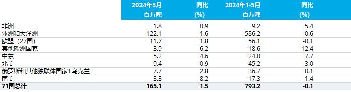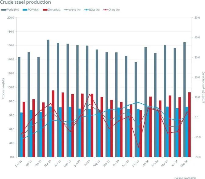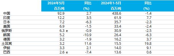 2024年5月,全球71個(gè)納入世界鋼鐵協(xié)會統(tǒng)計(jì)國家或地區(qū)的粗鋼產(chǎn)量為1.651億噸,同比增長1.5%。