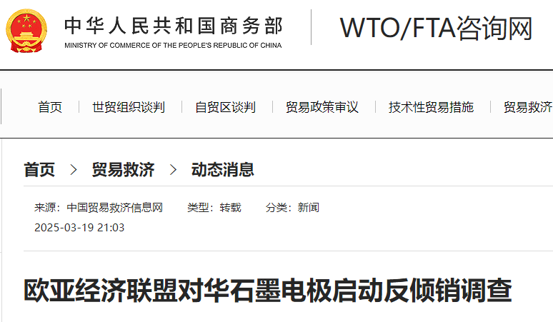 2025年2月28日,歐亞經(jīng)濟委員會內(nèi)部市場保護司發(fā)布第2025/431/AD40號公告稱,應(yīng)歐亞經(jīng)濟聯(lián)盟企業(yè)申請,依據(jù)2025年2月24日第1號令,對原產(chǎn)于中國的石墨電極(俄語:отношении графитированныхэлектродов диаметром более 520 мм, но не более 650 мм)啟動反傾銷調(diào)查。涉案產(chǎn)品為爐用,橫截面直徑介于520~650毫米(含)的圓形橫截面石墨電極,以及橫截面面積介于2700~3300平方厘米(含)的其他橫截面石墨電極;涉案產(chǎn)品的歐亞經(jīng)濟聯(lián)盟稅號為8545110020。
