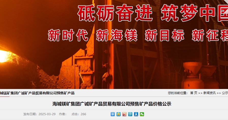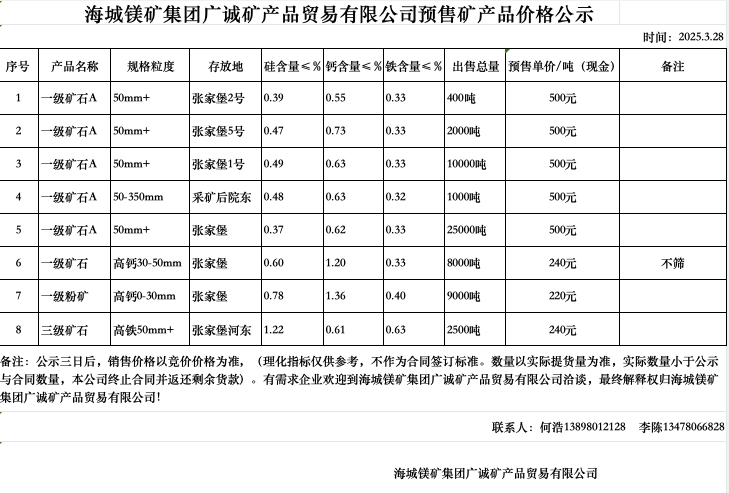 海城鎂礦集團廣誠礦產(chǎn)品貿(mào)易有限公司預(yù)售礦產(chǎn)品價格公示