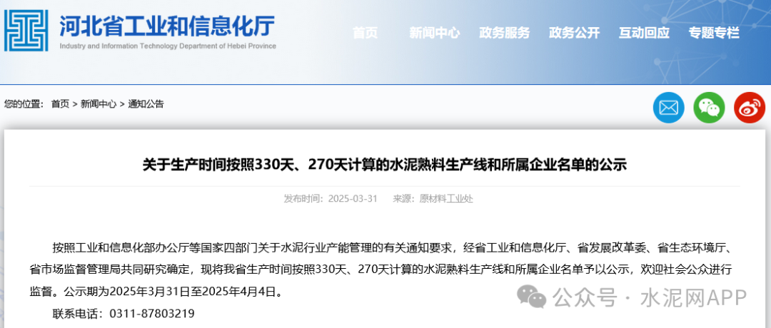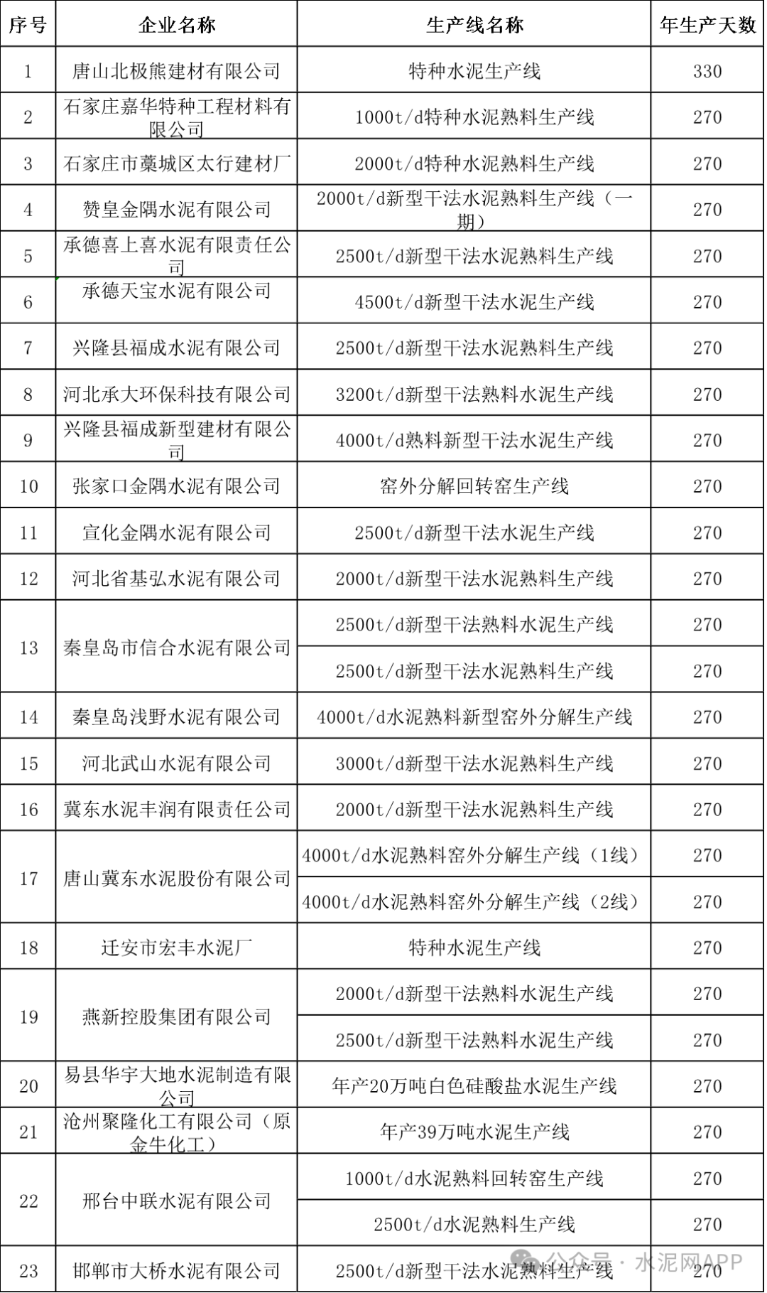 近日,河北省工信廳發(fā)布“關(guān)于生產(chǎn)時(shí)間按照330天、270天計(jì)算的水泥熟料生產(chǎn)線和所屬企業(yè)名單的公示”稱,按照工業(yè)和信息化部辦公廳等國(guó)家四部門關(guān)于水泥行業(yè)產(chǎn)能管理的有關(guān)通知要求,經(jīng)省工業(yè)和信息化廳、省發(fā)展改革委、省生態(tài)環(huán)境廳、省市場(chǎng)監(jiān)督管理局共同研究確定,現(xiàn)將河北省生產(chǎn)時(shí)間按照330天、270天計(jì)算的水泥熟料生產(chǎn)線和所屬企業(yè)名單予以公示。內(nèi)容顯示,1家水泥企業(yè)生產(chǎn)時(shí)間按照330天計(jì)算,22家企業(yè)按照270天計(jì)算。(據(jù)了解,按照最新版水泥行業(yè)產(chǎn)能置換實(shí)施辦法,水泥年產(chǎn)能天數(shù)按照300天計(jì)算。)