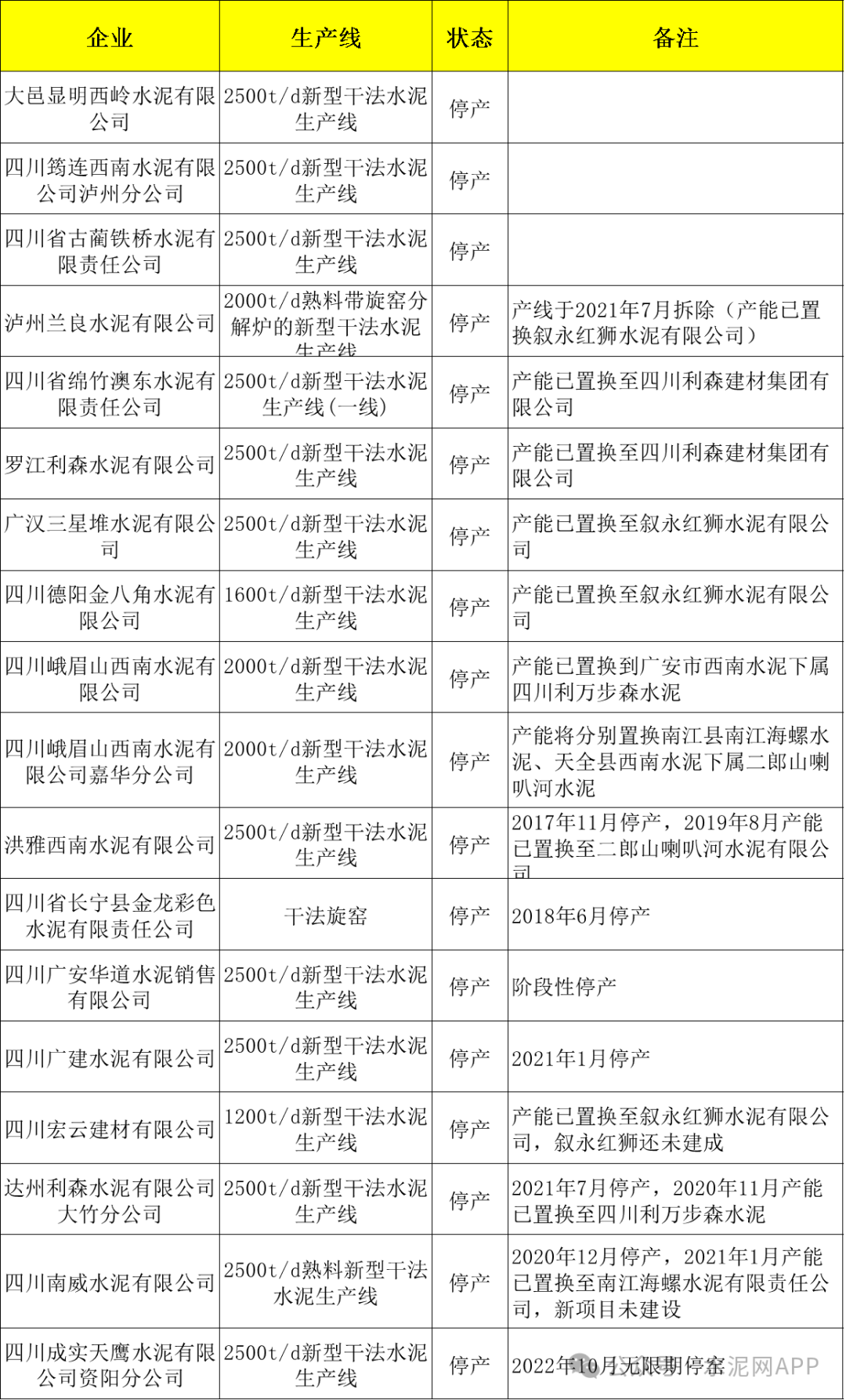 截至2024年底,四川省水泥熟料生產(chǎn)線共計(jì)109條,其中18條生產(chǎn)線停產(chǎn),具體見下: