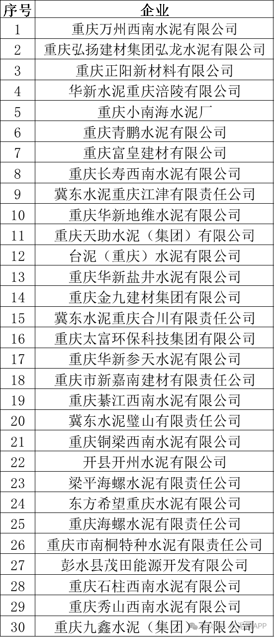 根據(jù)公布的名單,30家水泥企業(yè)納入《2024年度重慶市納入全國碳排放權(quán)交易市場發(fā)電外其他行業(yè)重點(diǎn)排放單位名錄》。