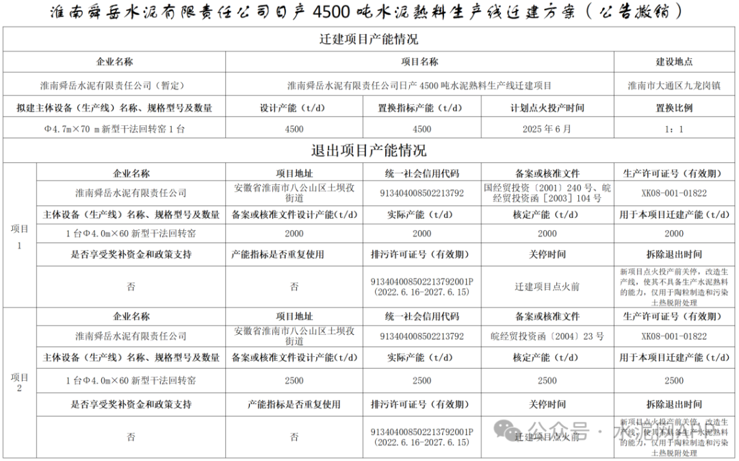 2023年3月,原安徽省經(jīng)濟和信息化廳(現(xiàn)安徽省工業(yè)和信息化廳)對淮南舜岳水泥有限責任公司日產(chǎn)4500噸水泥熟料生產(chǎn)線遷建方案進行公告(皖經(jīng)信公告〔2023〕8號)。后因市場預(yù)期和政策變化,項目未開工建設(shè)。根據(jù)《水泥玻璃行業(yè)產(chǎn)能置換實施辦法(2024年本)》,經(jīng)淮南舜岳水泥有限責任公司申請,淮南市工業(yè)和信息化局審核、公示后上報,現(xiàn)將上述項目生產(chǎn)線遷建方案予以撤銷。