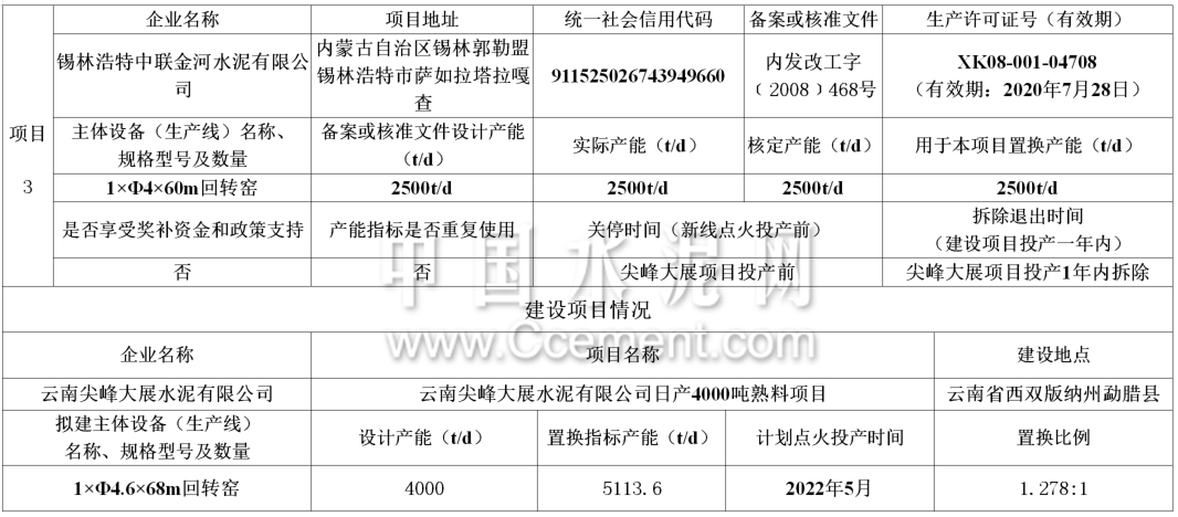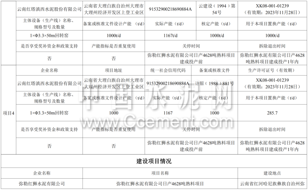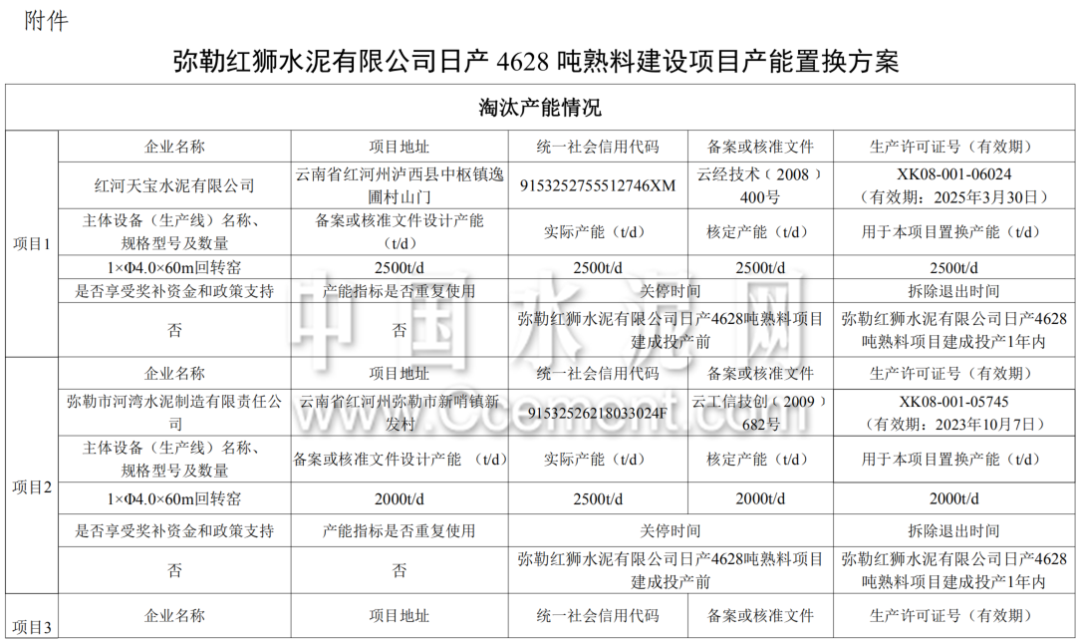 其中彌勒紅獅水泥有限公司4628t/d新型干法水泥熟料生產(chǎn)線(帶9MW純低溫余熱發(fā)電)、云南尖峰大展水泥有限公司日產(chǎn)4000噸熟料建設(shè)項(xiàng)目入選省級(jí)重大項(xiàng)目清單。彌勒紅獅水泥有限公司4628t/d新型干法水泥熟料生產(chǎn)線(帶9MW純低溫余熱發(fā)電)項(xiàng)目:據(jù)悉,項(xiàng)目占地679.95畝,總投資約16.2億元,采用新型干法分解生產(chǎn)工藝,建設(shè)一條日產(chǎn)4628噸水泥熟料生產(chǎn)線,配套9MW純低溫余熱發(fā)電項(xiàng)目、20萬(wàn)噸/年固(危)廢項(xiàng)目、年產(chǎn)500萬(wàn)噸骨料礦山項(xiàng)目,配套建設(shè)原料堆場(chǎng)、石灰石均化庫(kù)、包裝、散裝及水、電、辦公區(qū)等公輔設(shè)施。據(jù)云南工信廳,彌勒紅獅水泥4628t/d熟料產(chǎn)能置換項(xiàng)目如下: