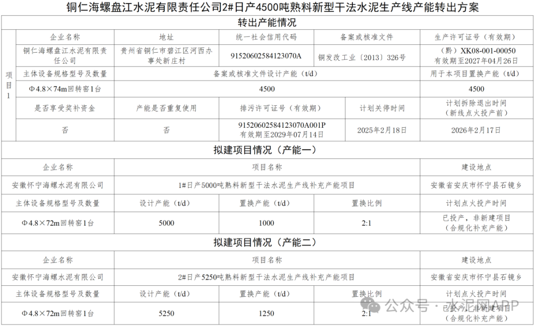 轉(zhuǎn)出產(chǎn)能:銅仁海螺盤(pán)江水泥2#4500t/d置換補(bǔ)充產(chǎn)能:安徽懷寧海螺1#1000t/d;2#1250t/d置換比例:2:1
