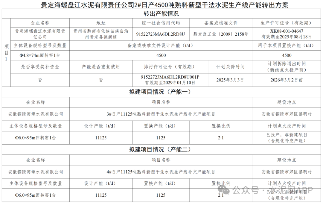 轉(zhuǎn)出產(chǎn)能:貴定海螺盤(pán)江2#4500t/d置換補(bǔ)充產(chǎn)能:安徽銅陵海螺水泥3#1125t/d;4#1125t/d置換比例:2:1