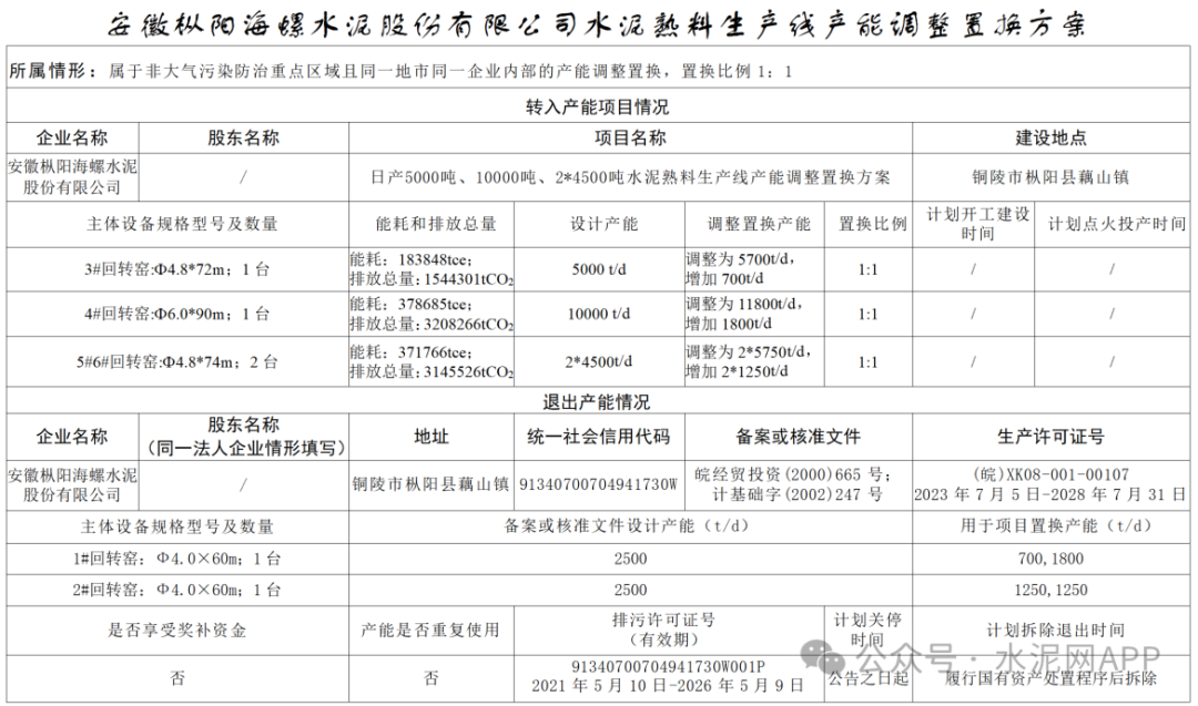 轉(zhuǎn)出產(chǎn)能:安徽樅陽(yáng)海螺1#2500t/d;2#2500t/d置換補(bǔ)充產(chǎn)能:安徽樅陽(yáng)海螺3#700t/d;4#1800t/d;5#1250t/d;6#1250t/d置換比例:1:1