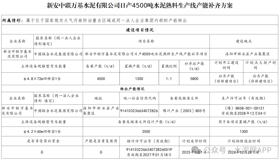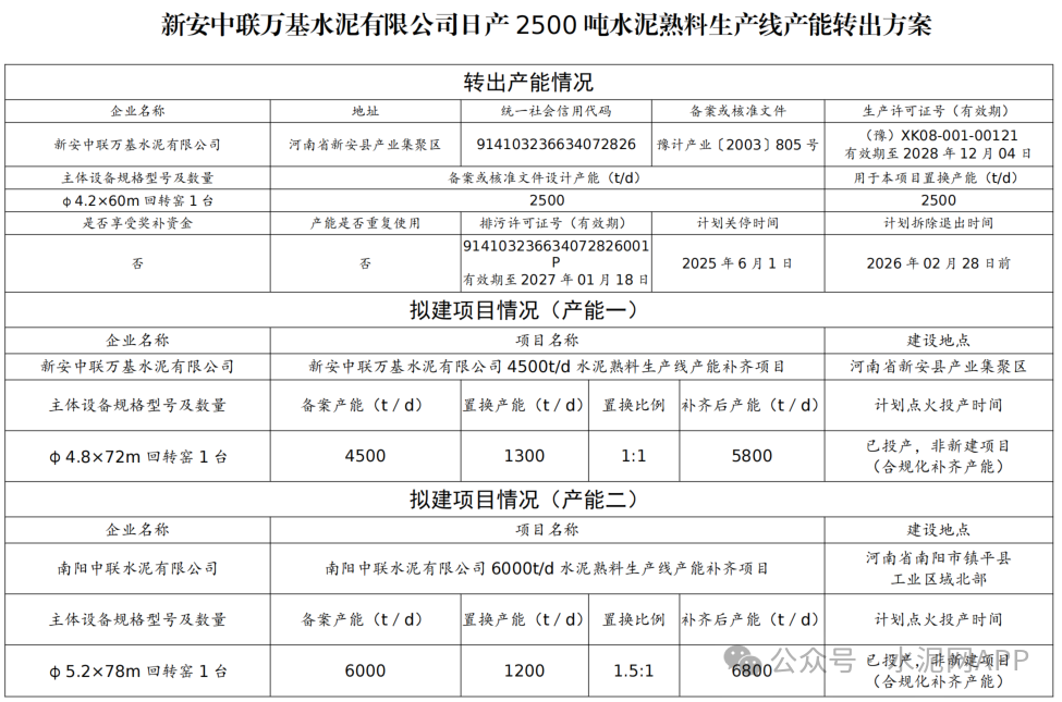 內(nèi)容顯示,新安中聯(lián)萬基水泥4500t/d熟料生產(chǎn)線置換補充產(chǎn)能1300t/d,補充后產(chǎn)能為5800t/d,出讓產(chǎn)能來自同公司2500t/d熟料生產(chǎn)線,用于本產(chǎn)能1300t/d,置換比例1:1;剩余1200t/d熟料產(chǎn)能用于補充南陽中聯(lián)6000t/d熟料生產(chǎn)線,補充后南陽中聯(lián)生產(chǎn)線產(chǎn)能達(dá)到6800t/d,置換比例1.5:1。