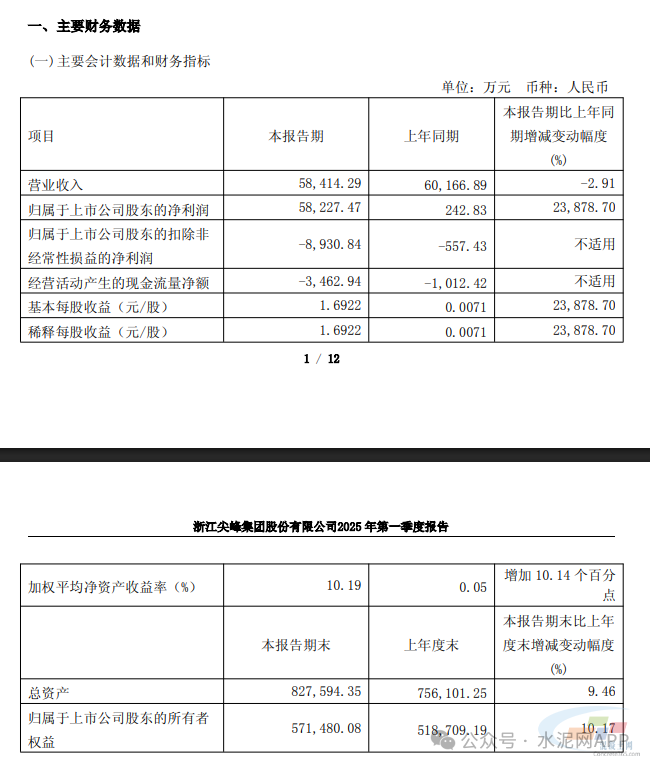 4月29日,浙江尖峰集團股份有限公司(尖峰集團,600668.SH)披露一季報,2025年第一季度公司營業(yè)收入為5.84億元,同比下降2.91%;歸屬于上市公司股東的凈利潤為5.82億元,同比增長23878.70%;主要系報告期公司權益法核算的聯(lián)營企業(yè)天士力集團利潤大幅增加所致。